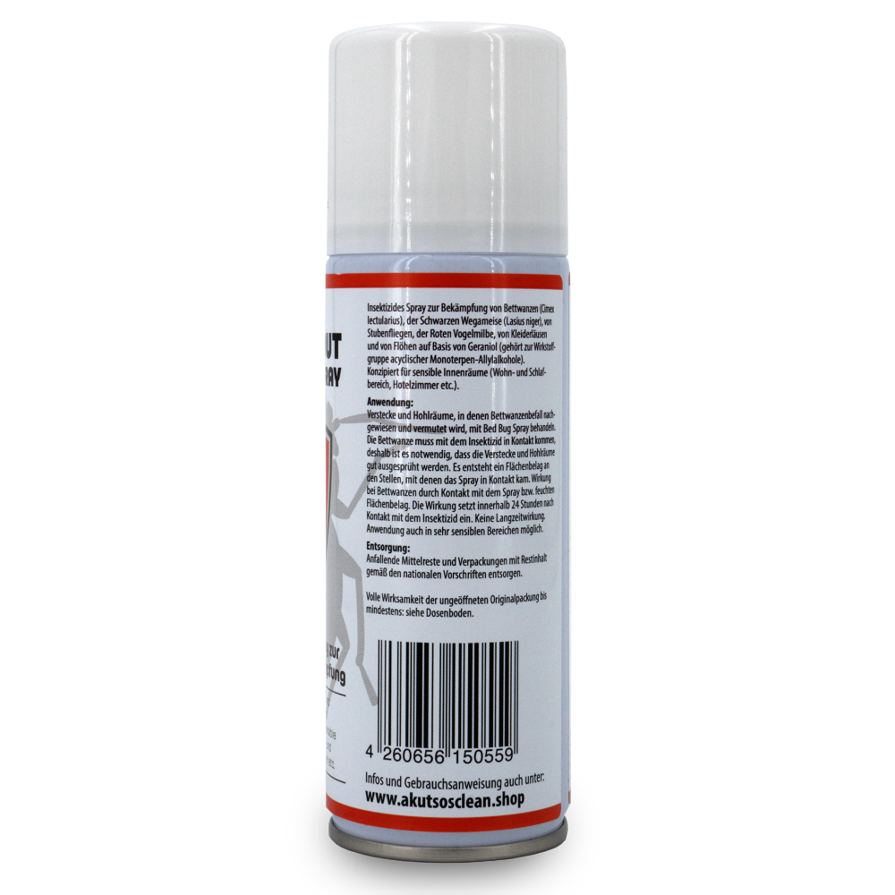 Insektizides Spray zur Bekämpfung von Bettwanzen (Cimex lectularius), der Schwarzen Wegameise (Lasius niger), von Stubenfliegen, der Roten Vogelmilbe, von Kleiderläusen und von Flöhen auf Basis von Geraniol (gehört zur Wirkstoff- gruppe acyclischer Monoterpen-Allylalkohole).
