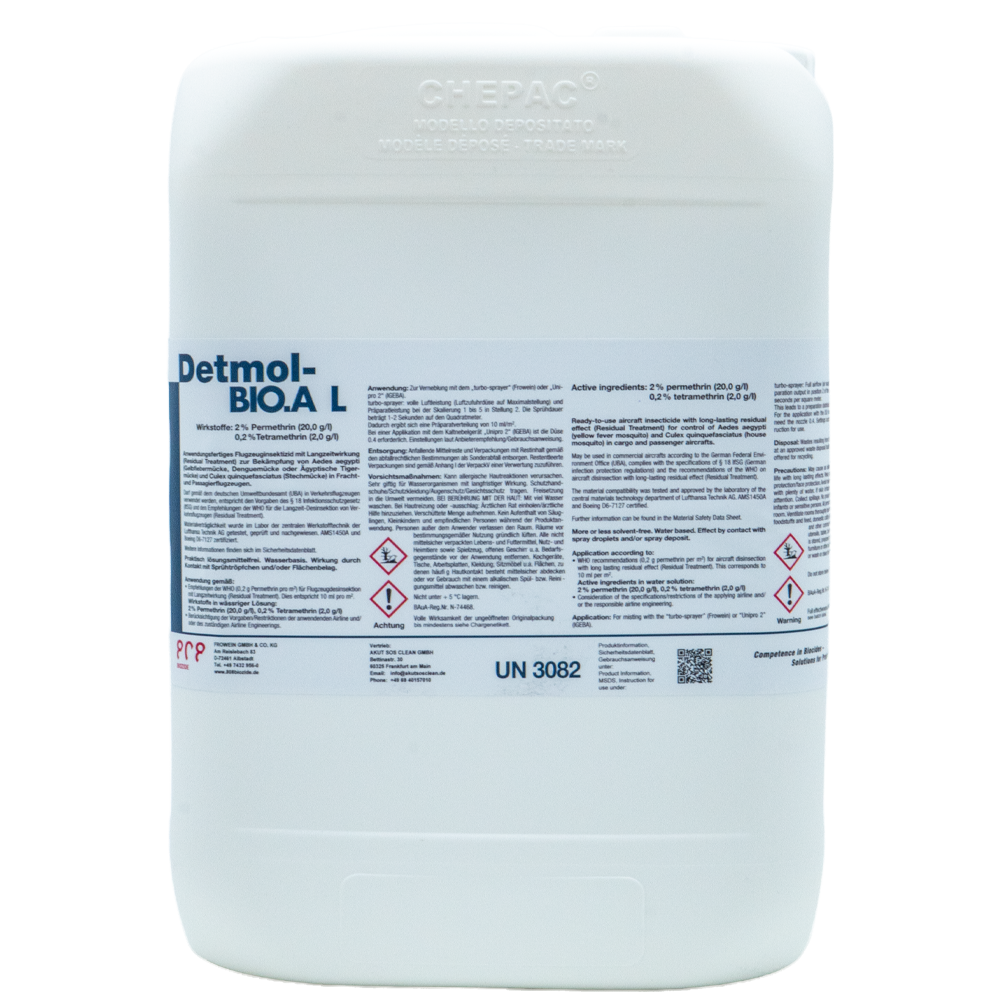 Detmol-BIO A L ist ein wasserbasierendes, nahezu lösungsmittelfreies Insektizid mit Sofort- und Langzeitwirkung. Es wurde speziell für den Einsatz in Passagier- und Frachtflugzeugen entwickelt und ist gemäß den Vorgaben der WHO sowie §18 Infektionsschutzgesetz (IfSG) offiziell anerkannt.