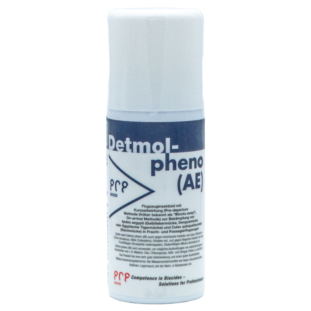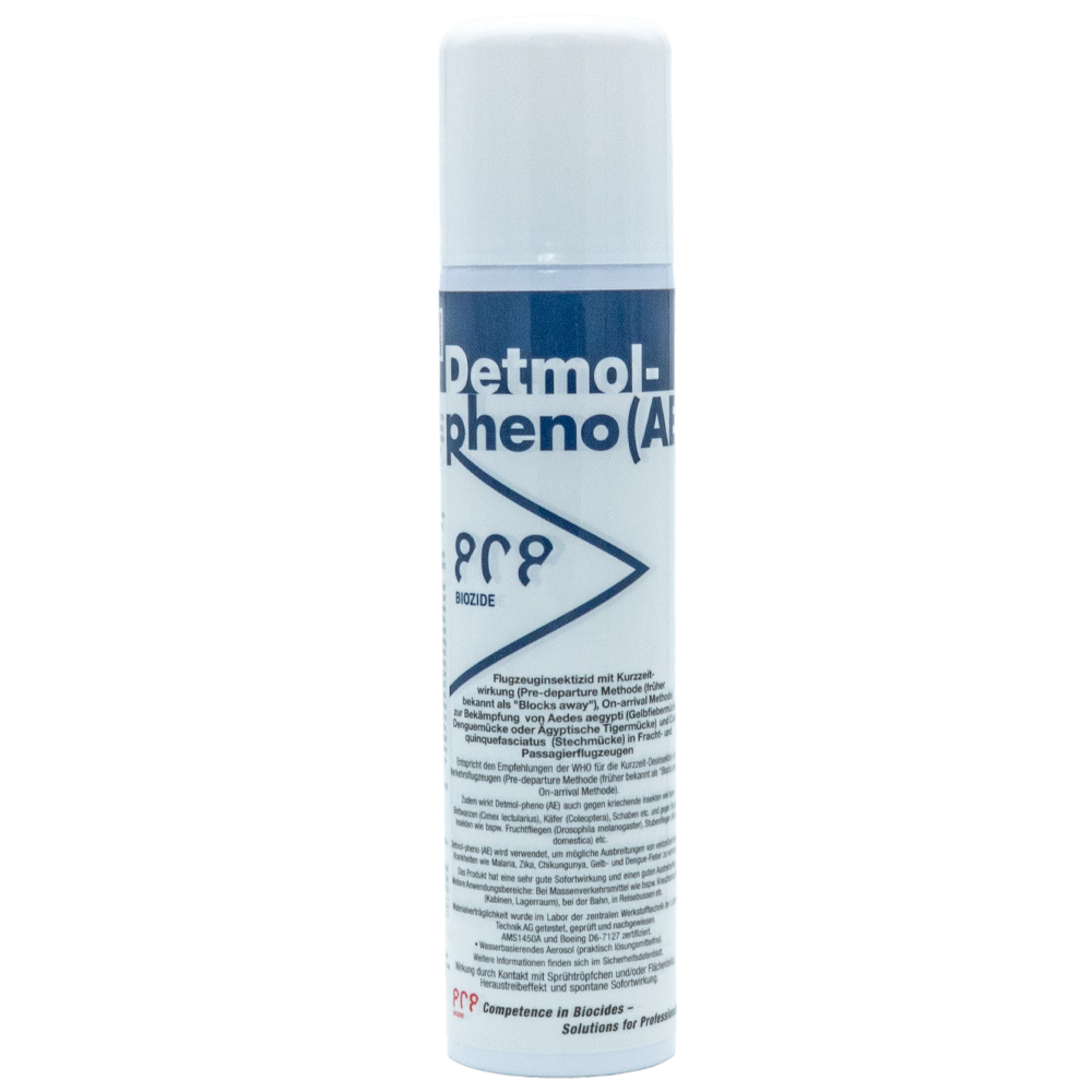 Detmol-pheno (AE) ist ein wasserbasierendes Aerosol zur schnellen und effektiven Bekämpfung von Insekten wie Stechmücken (z. B. Aedes aegypti), Bettwanzen, Fruchtfliegen oder Schaben in Flugzeugen, Reisebussen, Zügen und Kreuzfahrtschiffen.