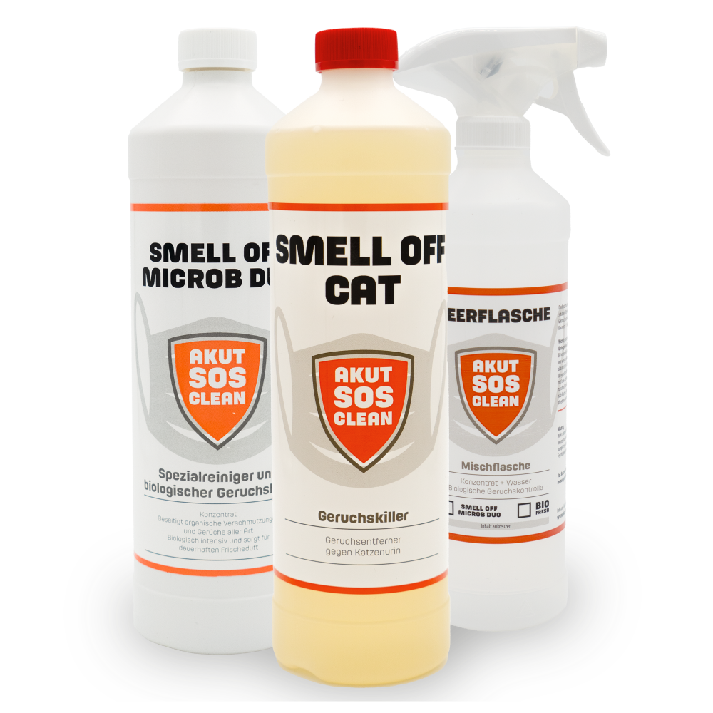 Das Set beinhaltet eine 1l Flasche SMELL OFF CAT, 1l Flasche SMELL OFF MICROB DUO und eine Leerflasche zum Präparieren des Produktes.