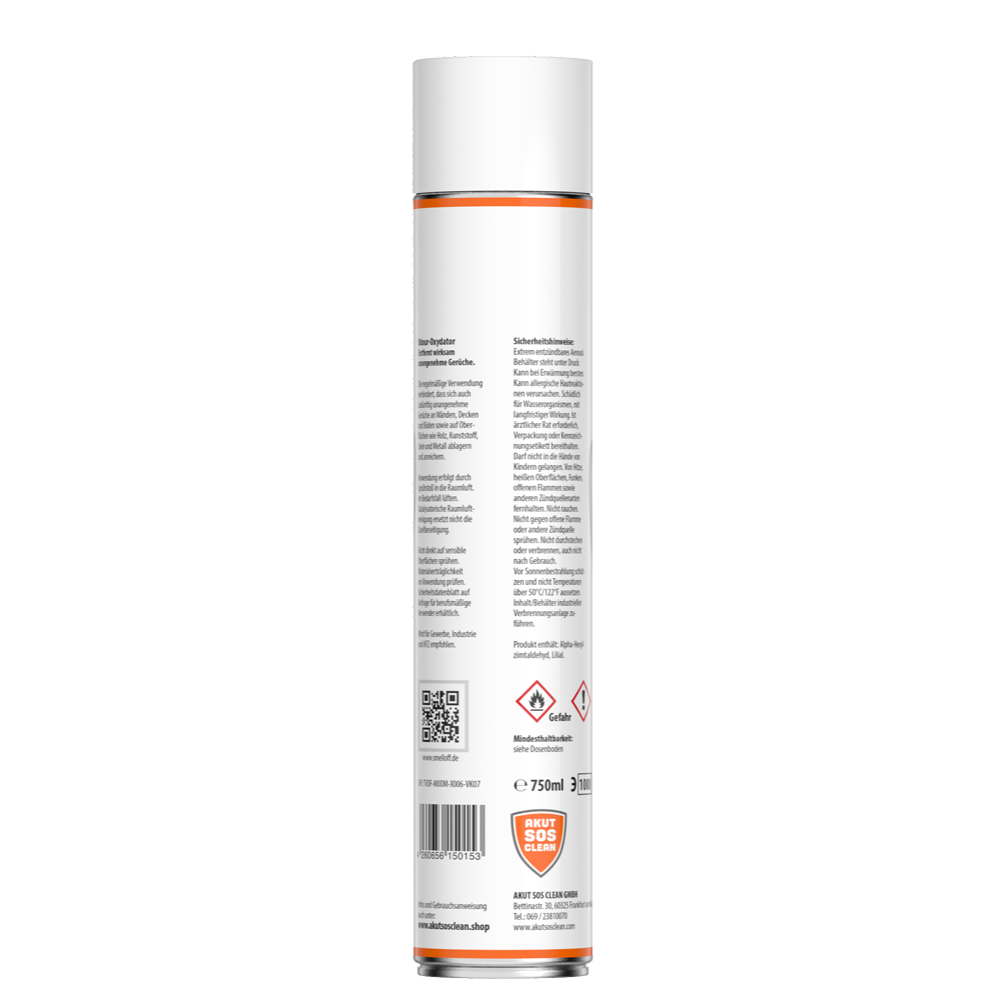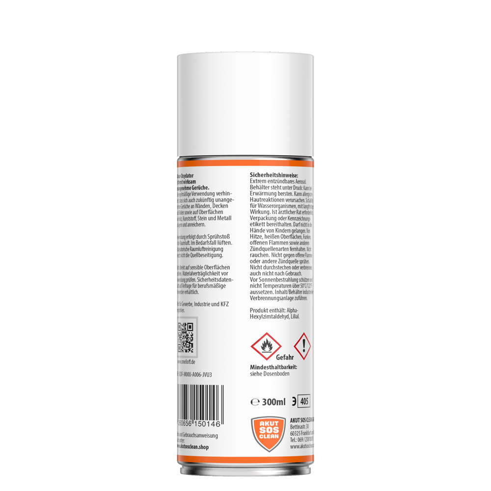Im Gegensatz zu zahlreichen anderen Lufterfrischern ist der AKUT SOS CLEAN Geruchsreiniger kein Raumduft, sondern ein Raumgeruch-Beseitiger mit langfristig eintretender Wirksamkeit.Der ergiebige Problemlöser bei unangenehmen Gerüchen überdeckt unschöne Düfte nicht nur, sondern zersetzt und entfernt sie vollständig.Ist die Quelle des üblen Geruchs einmal entfernt, beseitigt der Odour-Oxydator olfaktorische Verunreinigungen restlos und ergiebig, so dass lediglich ein frisches Raumgefühl zurückbleibt