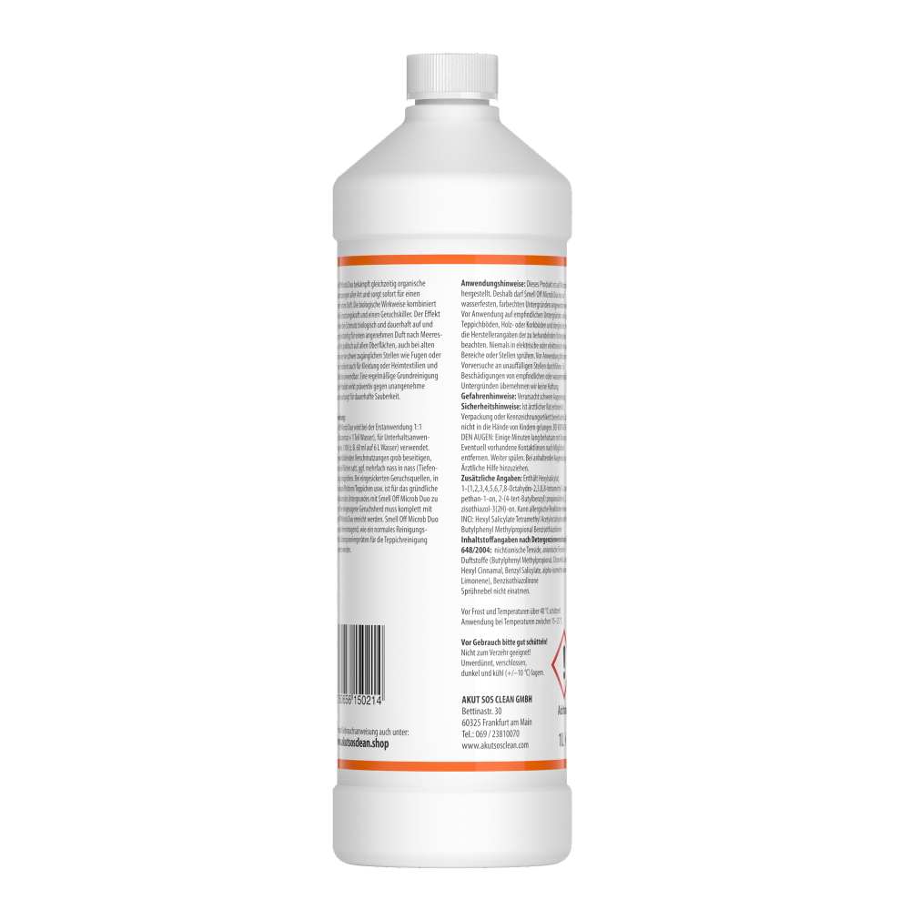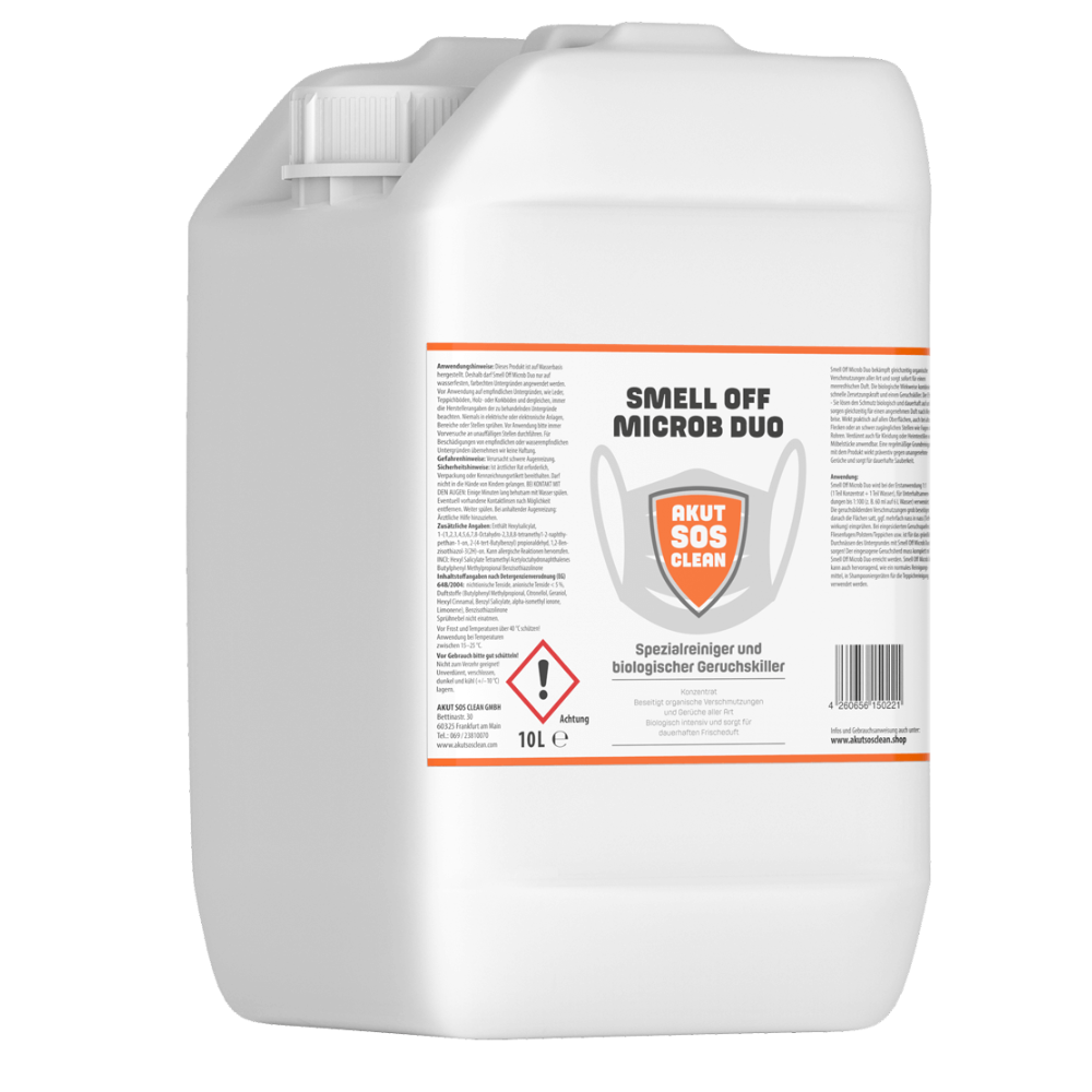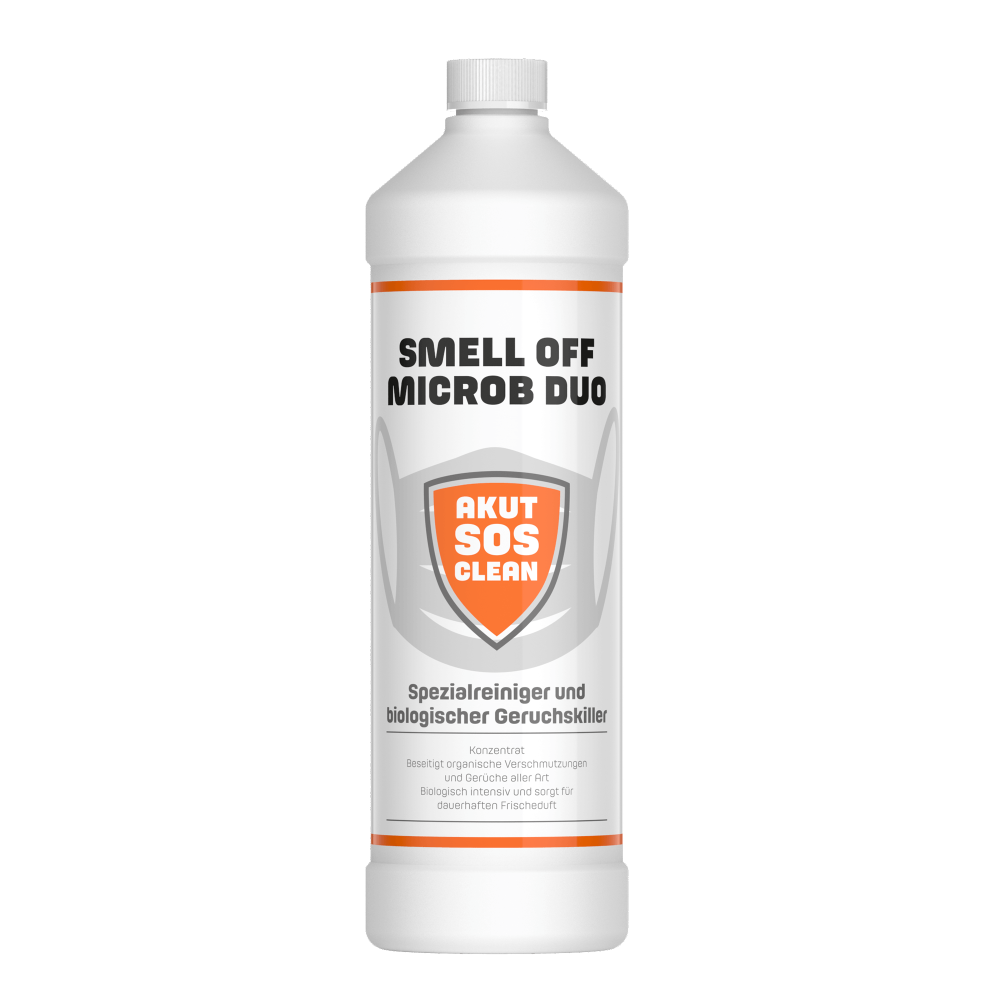 Smell Off Microb Duo bekämpft gleichzeitig organische Verschmutzungen aller Art und sorgt sofort für einen meeresfrischen Duft. Die biologische Wirkweise kombiniert schnelle Zersetzungskraft und einen Geruchskiller. Der Effekt - Sie lösen den Schmutz biologisch und dauerhaft auf und sorgen gleichzeitig für einen angenehmen Duft nach Meeres- brise. Wirkt praktisch auf allen Oberflächen, auch bei alten Flecken oder an schwer zugänglichen Stellen wie Fugen oder Rohren. Verdünnt auch für Kleidung oder Heimtextilien und Möbelstücke anwendbar. Eine regelmäßige Grundreinigung mit dem Produkt wirkt präventiv gegen unangenehme Gerüche und sorgt für dauerhafte Sauberkeit.